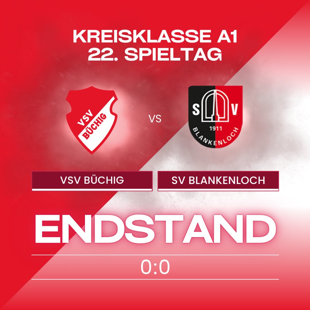 Am 22. Spieltag stand das traditionsreiche Derby gegen den SV Blankenloch auf dem Programm. Unter Flutlicht und vor rund 250 Zuschauern war schnell klar, wie beide Mannschaften agieren wollten. Der VSV versuchte über viel Ballbesitz die Partie zu kontrollieren, der SVB setzte auf eine kompakte Defensive und schnelle Konter. Die Büchiger Elf tat sich auf dem kleineren Trainingsplatz im heimischen Sportpark aber von Beginn an schwer klare Torchancen herauszuspielen. Zu viele Ungenauigkeiten gegen eine konzentriert verteidigende Blankenlocher Mannschaft ließen wenig Spielfluss entstehen. Die wenigen Gegenangriffe der Gäste hatte man in Abschnitt eins gut im Griff. Erst ein Fehlpass von Böhm im Spielaufbau brachte Rothe in eine vielversprechende Kontersituation, er wurde allerdings von Böhm von den Beinen geholt. Die Chance war dahin und der Büchiger sah zurecht den gelben Karton. Auf der Gegenseite versuchten es Dreyer und Hadeler aus der Distanz, zielten aber deutlich vorbei und vielversprechende Hereingaben von Müller und Moysich auf den kurzen Pfosten fanden danach keinen Abnehmer. Große Aufregung nach rund 30 Minuten: Batke köpfte eine Flanke am langen Pfosten auf das Tor und Amoruso wehrte den Ball über dem Kopf mit der Hand ab. Einen Strafstoß gab es in der Situation leider nicht. Kurz vor der Pause zeigte der VSV seinen besten Angriff: Dreyer bediente Batke, der per Kopf quer auf M.Kanoukov ablegte. Aus zentraler Position acht Meter vor dem Tor zielte der beste Büchiger Torjäger aber über das Tor.