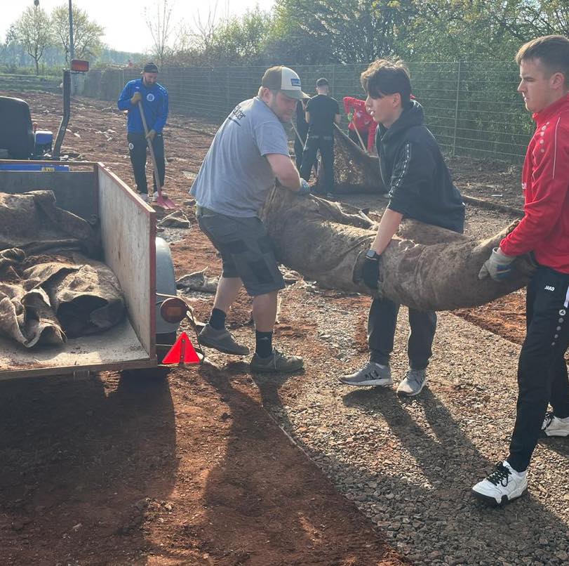 Nach einer kurzen Osterpause, in der mit einem Bagger die Gras- und Erdschicht abgetragen wurde, stand heute beim 4.Arbeitseinsatz das Entfernen des Fleece-Teppichs auf der Agenda.
